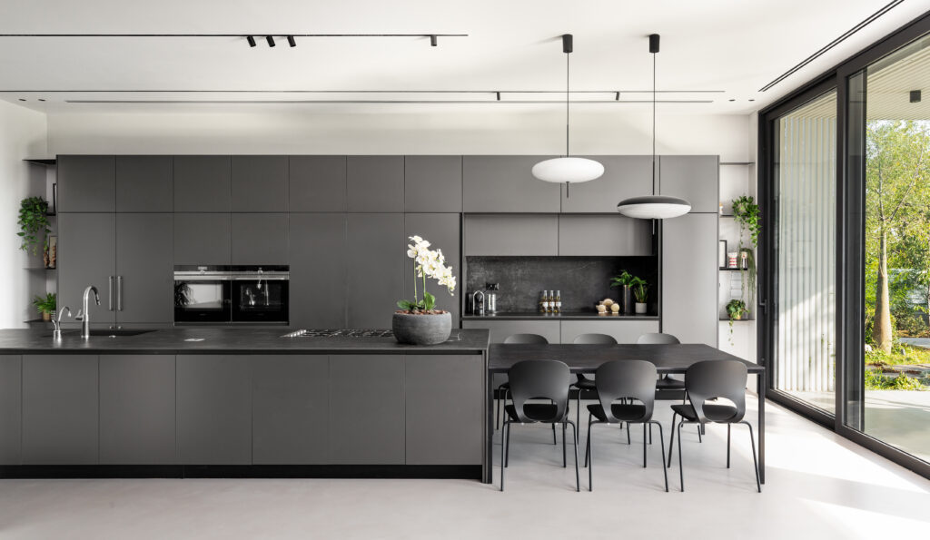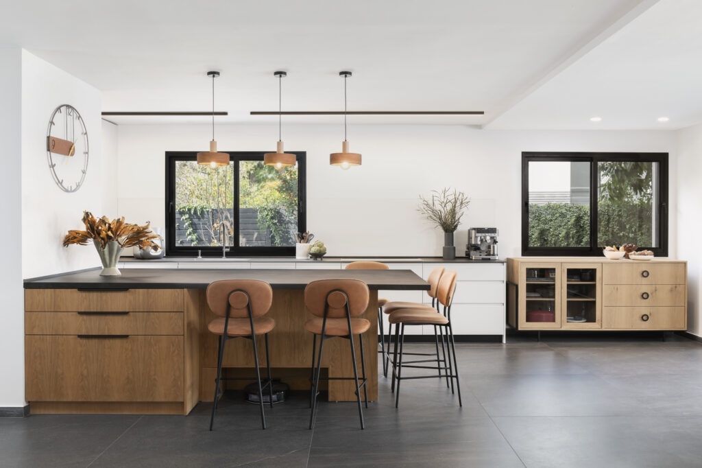 גופי תאורה תלויים מעל אי במטבח בשילוב תאורת פרופיל ליניארית ושקועים בחלל המטבח